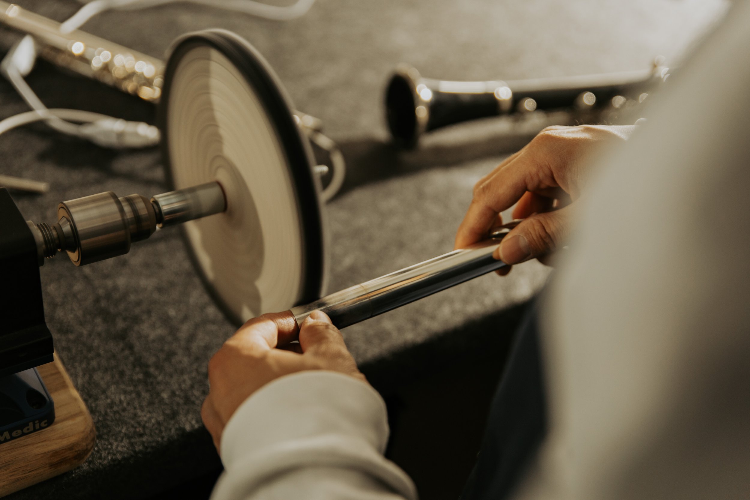 Professional polishing to remove tarnish and restore shine to clarinet keys and silver-plated flutes.